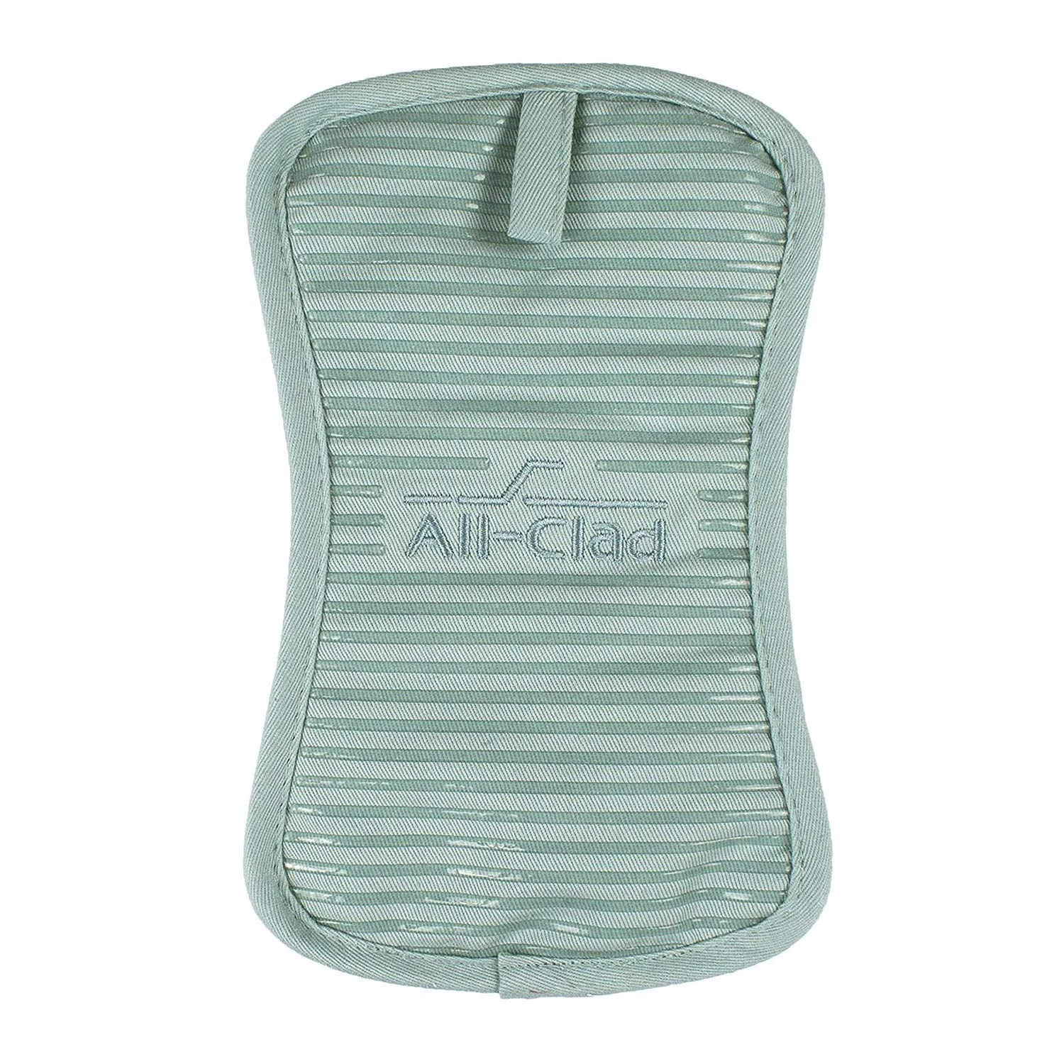 Grab hot dishes from the oven with the All-Clad Cotton and Silicone Pot Holder! This Rainfall green twill pot holder is made from 100% cotton with a silicone treatment that provides a nonslip grip. Designed to serve multiple purposes, you can use it like a pocket-style oven mitt to grab pans from the oven and then use it as a hot pad to protect your countertop or table from hot baking dishes. Heat-resistant to 500°F, stain-resistant, and machine washable, this space saving pot holder is a simple kitchen essential elevated! Hang it by your stove or slide it into a drawer so there’s always a pot holder at the ready.