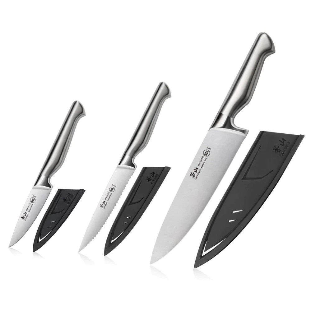 Equip your kitchen for all your essential slicing, dicing and chopping tasks with the Sanford Series 3-Piece Starter Set from Cangshan Cutlery. Every knife from Cangshan is hand-crafted and hand-sharpened by skilled artisans, ensuring the highest quality in every blade. Made of high alloy German steel, these blades are durable and stain-resistant with long-lasting edge retention. The razor sharp 16° edges allow for effective cutting, while the angled bolster and well-balanced ergonomic handles provide a natural and secure grip. With a stainless matte finish and strong, sleek design, these knives make a sophisticated and powerful statement. Completing the set are 3 fitted plastic sheathes for safely storing your knives and protecting the blades while not in use. For knives that impart efficiency and style to your meal prep routine, order your Cangshan Cutlery Sanford Series 3-Piece Starter Set today.Â