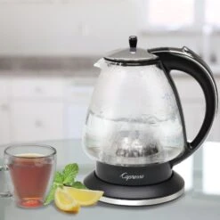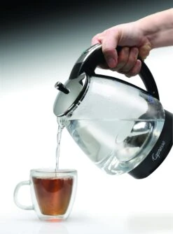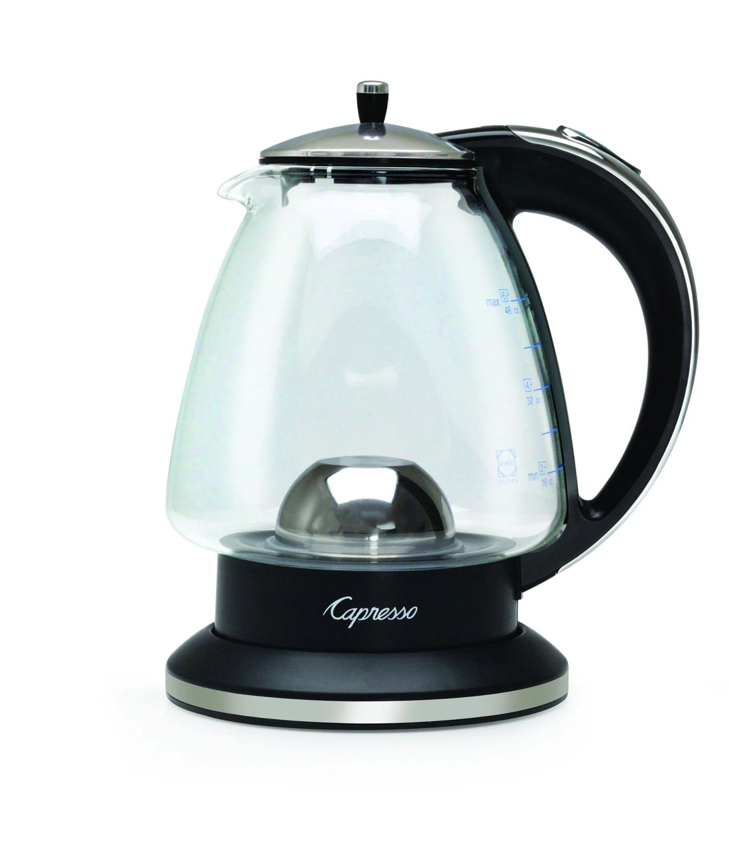 Trade in your traditional tea kettle for this modern Capresso H2O Glass Electric Water Kettle. With 1500w of power, it quickly and safely brings water to a boil, consuming a lot less energy than your stovetop as it does. The Capresso H2O Glass water kettle is constructed of German-made SCHOTT heat resistant glass and has ounce and cup markings for easy filling. A gleaming stainless steel dome covers the highly efficient concealed heating element which boils water fast, quietly and safe…then shuts off automatically.Â
