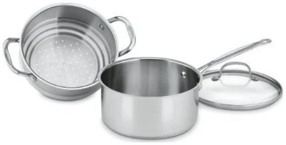 - 3 Pieces: Three-Quart Saucepan, Steamer Insert and Tight-Fitting Glass Lid