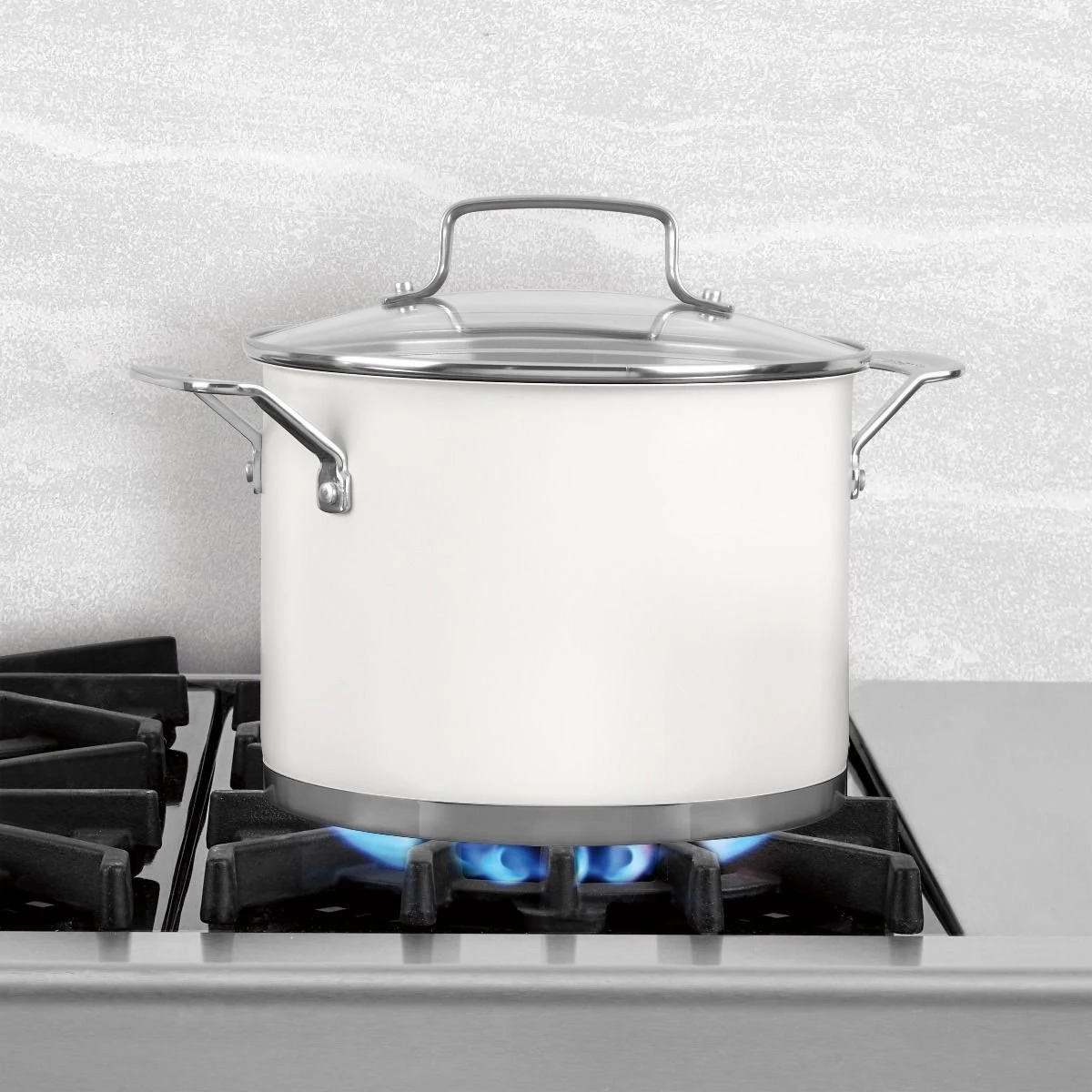 Looking to elevate your cookware selection in your gorgeous kitchen? The Cuisinart Matte White 6 Qt. Stainless Steel Stockpot with Cover is an investment that will prove its timelessness for every use. Made from stainless steel, this pot features an exclusively designed aluminum encapsulated base that brags optimal heat conductivity and even heat distribution. The stockpot’s tall, narrow sides ensure liquid contents take their time evaporating as opposed to a normal pot where the contents are exposed to the air, particularly with its tempered glass lid, so the Stockpot is ideal for long-simmering mixtures like stocks and soups. Adorned with a divine white matte exterior, this pot will be the piece to make your stovetop shine, and it is induction-ready. With a riveted stainless steel Cool Grip™ handle, maneuvering your skillet remains unrivaled, as it resists heat and has a comfortable grip.