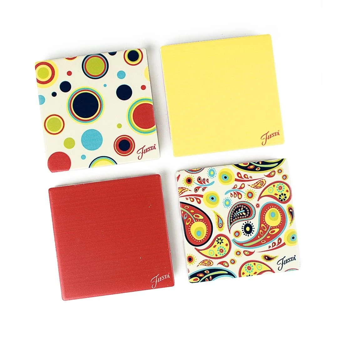 Enjoy your favorite ice-cold drinks this summer without sacrificing the lifespan of your hardwoods and get the Paisley Dots Coaster Set from Fiesta®! The coasters feature two solid red and yellow prints, a vintage paisley design, and a dotted design, all with deep reds, vibrant blues, and warm yellows. Made from gypsum stone, these coasters easily absorb the excess sweat from cold drinks and act as buffers between hot drinks and surfaces that may be damaged. The Fiesta® coasters measure 4.25″, so they will thoroughly protect your tables and counters from even larger cups or mugs. Mix and match these coaster sets from Fiesta® to decorate and protect your table in style! Get yours today and enjoy these beautifully printed coasters for years to come!