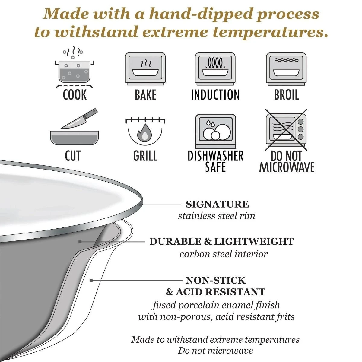 - Lightweight carbon steel core with durable enameled porcelain