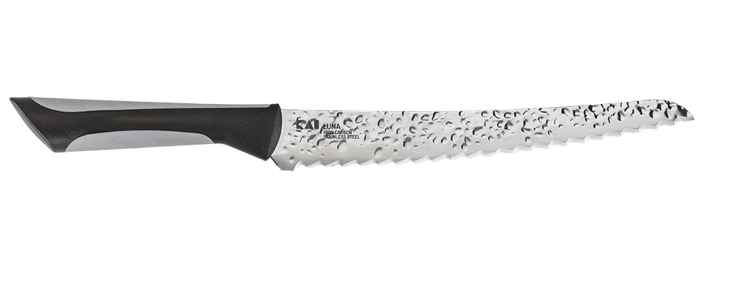 Glide your thick-crusted loaves of warm, fresh bread with Kai Houseware’s Luna 6” Bread knife in your hands. This bread knife features a beautiful hammered finish with a hand-sharpened serrated blade with excellent edge retention.