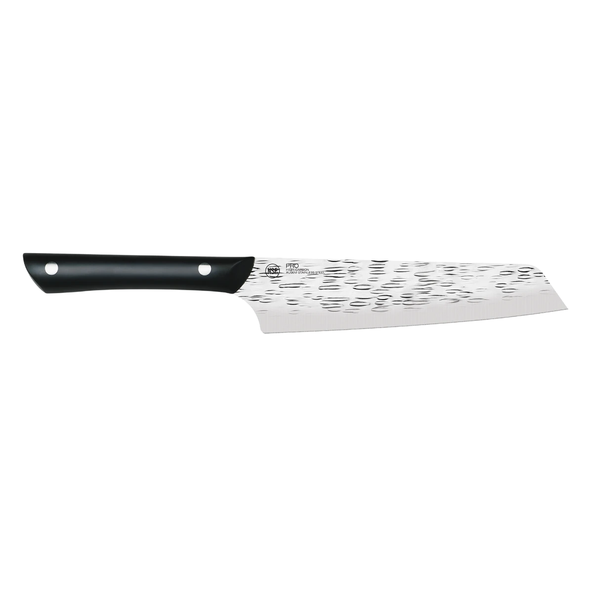NSF-certified for use in commercial kitchens, Kai PRO knives are made of Japanese AUS6M high-carbon stainless steel and hand sharpened to a 16° edge on each side. Full-tang with a double-riveted handle, the PRO series knives are built to stand up to daily, professional use. The striking hammered blade finish is more than just beautiful; it reduces drag and helps food release from the blade easily. With a limited lifetime warranty, you can count on the precision performance this Kai PRO knife will bring to your prep work.