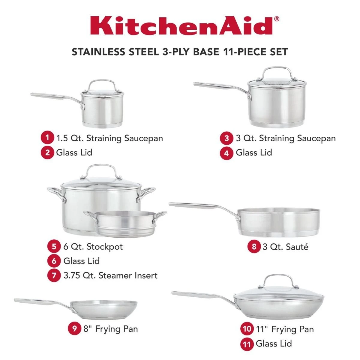 KitchenAid Stainless Steel 3-Ply Base 11-Piece Cookware Set Features: