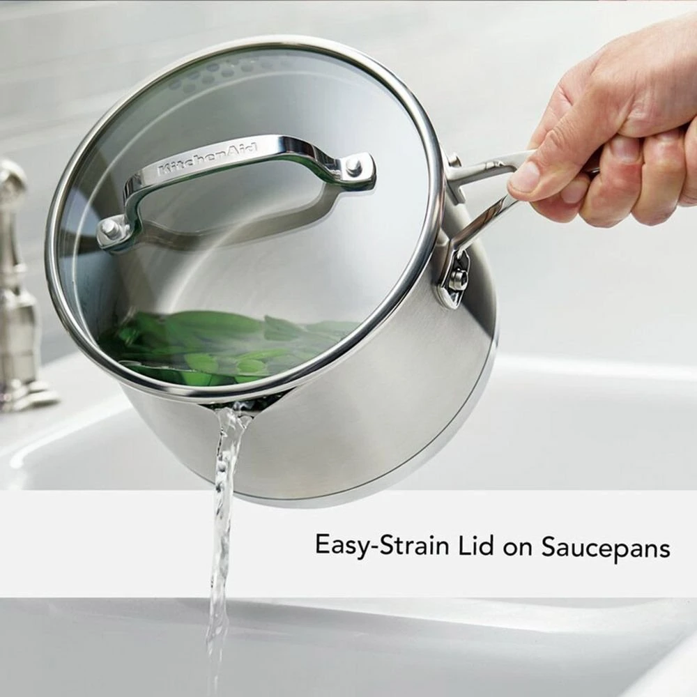 Constructed from high-quality 18/10 stainless steel, the 3-Ply Base 11-Piece Cookware Set from KitchenAid has a thick layer of heat-conducting aluminum sandwiched between two layers of stainless steel in the base for excellent edge-to-edge heat conductivity. Quickly sear meat, sauté vegetables, and reduce sauces on your way to making delicous meals on any stovetop, including induction. Volume measurements etched inside the saucepans and stockpot make it easy to measure ingredients, while all the pans and tempered-glass lids are dishwasher-safe to simplify cleanup and care. The lids for the two saucepans have built-in strainer rims so you can easily strain off liquid without the need for a standalone strainer. The cookware is oven-safe to 500ºF without the lids (350ºF with lids) making this 11-Piece Cookware Set as versatile as it is durable for everyday kitchen use.