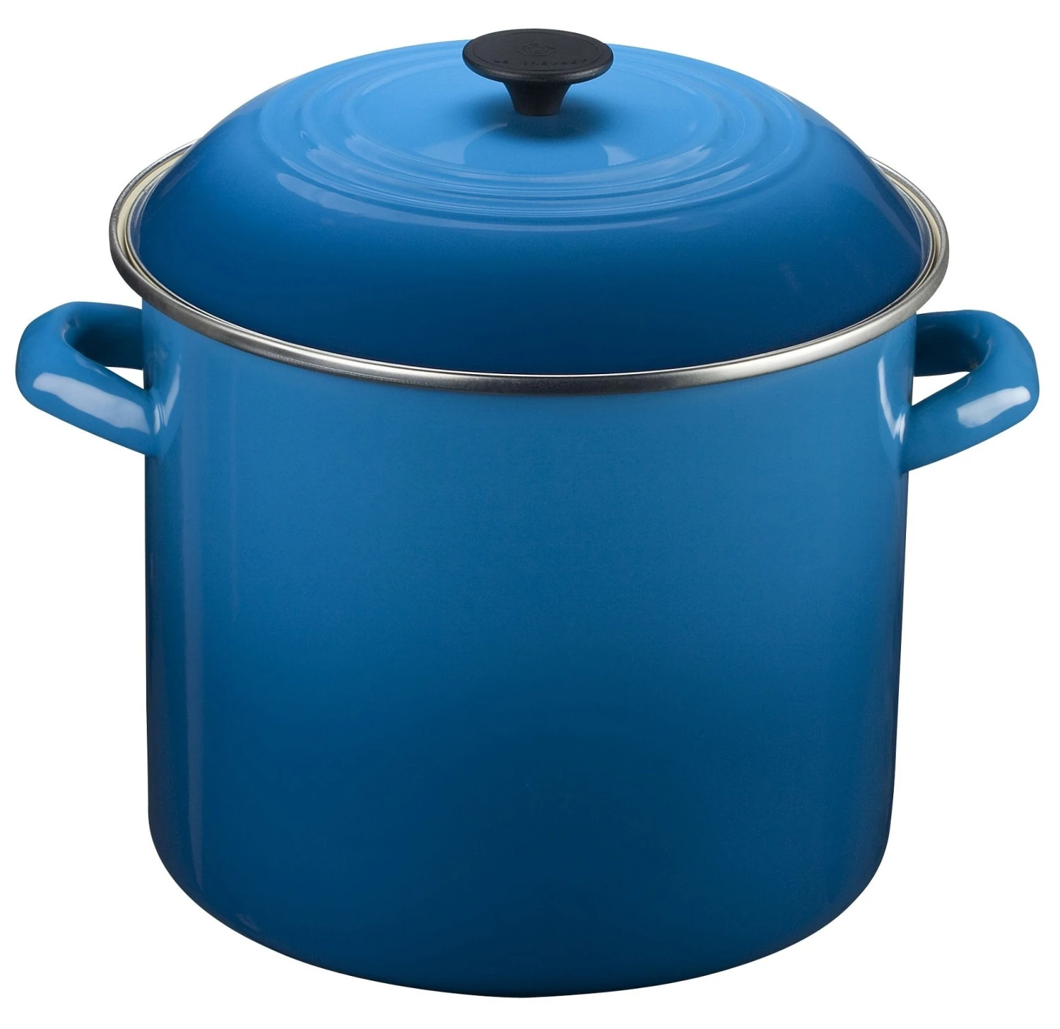 The Le Creuset 16-quart stock pot/soup pot is made from lightweight carbon steel pot with a rich Marseille Blue porcelain enamel. A matching lid is included to lock in heat and moisture during cooking, while a stainless-steel brim on both pieces minimizes chipping and cracking from repeated application and removal. The carbon steel quickly and evenly heats making it ideal for cooking soups, stews, chowders, bisques, and broths on your home stovetop.