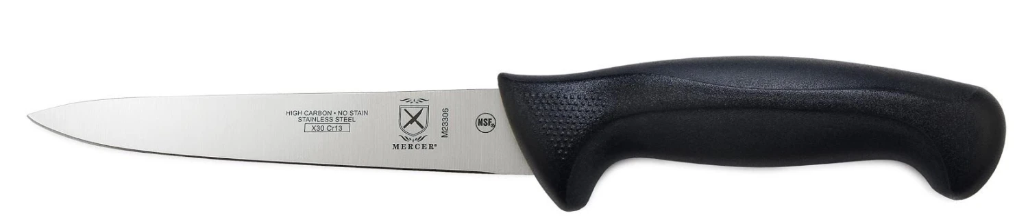 Prepare tricky produce and large cuts of meat with Mercer’s Millenniaâ„¢ 6″ Commercial Utility Knife. The ergonomic handle is designed with Santoprene for comfort and polypropylene for durability. Millenia blades are designed with one piece of high carbon stainless steel, razor-sharp edges, and textured fingers for an innovative design to meet the demands of today’s professional chefs. Â Mercer’s Milleniaâ„¢ 6″ Commercial Utility Knife has a straight blade ideal for slicing straight down to the cutting board!