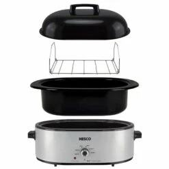 When it comes to making large meals to serve a party, it’s never been easier than with the Nesco 18-Quart Roaster in silver. This versatile cooker features ranged temperature control, from 200°F to 450°F. This control allows you to bake, steam, slow cook, or roast any number of recipes. Equipped with “Circle of Heat” technology and a specially designed lid, this roaster cooks evenly and promotes airflow for perfect results every time. With a massive capacity of 18-Quarts, this versatile cooker is large enough to cook a 22-pound turkey, making it a must-have for the holiday season every year. Don’t fuss with multiple pots and pans and save room in your oven, get the Nesco 18-Quart Roaster in Silver and make hosting your next dinner party or holiday party easier than ever before.Â
