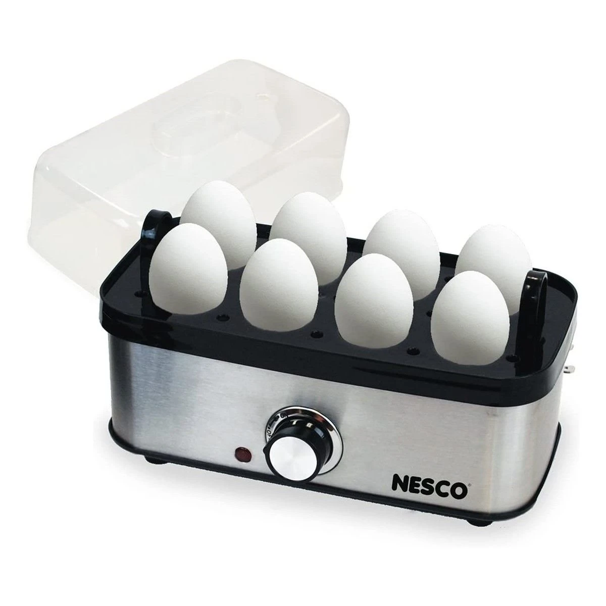When it comes to cooking eggs, the Nesco Deluxe Egg Cooker is the best appliance for your kitchen! Made from BPA-free plastic and stainless steel, this egg cooker delivers high-quality performance at 400 watts and cooks up to eight eggs at once. Simply utilize the piercing pin from the measuring cup to puncture the eggs, add the right amount of water inside the heating base, power on the egg cooker, and let the auto shut-off alarm sound off for hard, medium, or soft-boiled consistencies. With a clear, vented BPA-free lid, you may observe the cooking process. This appliance is perfect for those who love egg salad, deviled eggs, or poached eggs. Included with the egg cooker is a poaching tray that allows you to poach up to three eggs. Backed by a year-long manufacturer warranty, the Nesco Deluxe Egg Cooker will provide the best eggs for breakfast, brunches, and more for years to come!