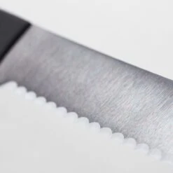 - Serrated edge blade has small, saw-like teeth to slice cleanly through food with delicate textures without damaging soft insides