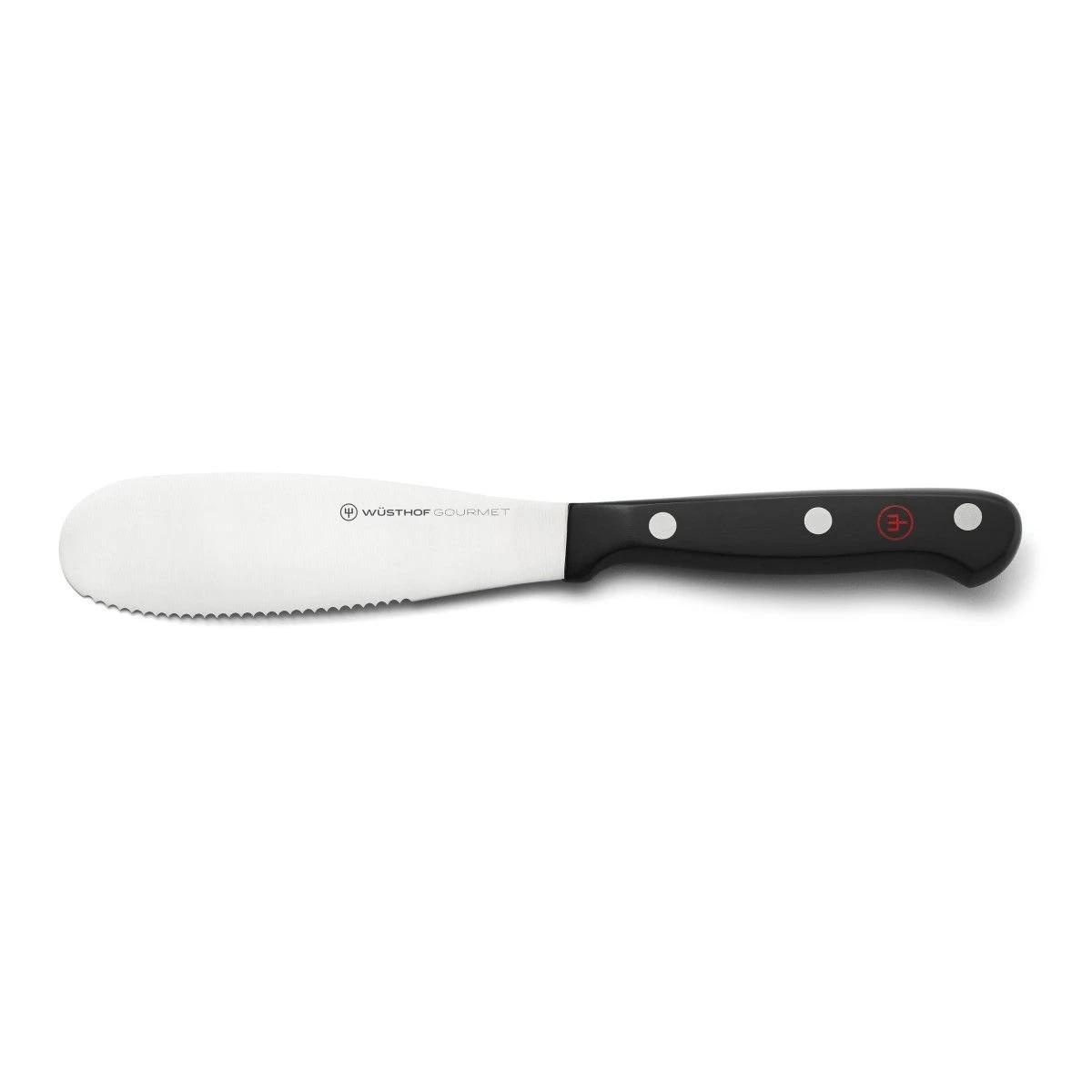 Your Wusthof Gourmet Collection would be perfect if it had a spreading knife for dips, butter, and jams. Fortunately, Wusthof carries such a thing. The Wusthof Gourmet 5″ Spreader is here to save the day! Made from German high-carbon stainless steel, this spreader can slice smoothly into butter and spread other condiments like peanut butter and mayonnaise onto crackers or bread for sandwiches. Just like other knives in the Gourmet collection, its handle is made from a black composite material called polyoxymethylene (POM for short) to last longer and resist fading and discoloration. An awesome feature of this spreader is the serrations along its blade, which also make it useful in cutting into bread, cheese, fruit, and vegetables. Consider it a different type of utility knife for brunches and afternoon snacks. Make your Gourmet collection complete with the useful and distinct Wusthof Gourmet 5″ Spreader!