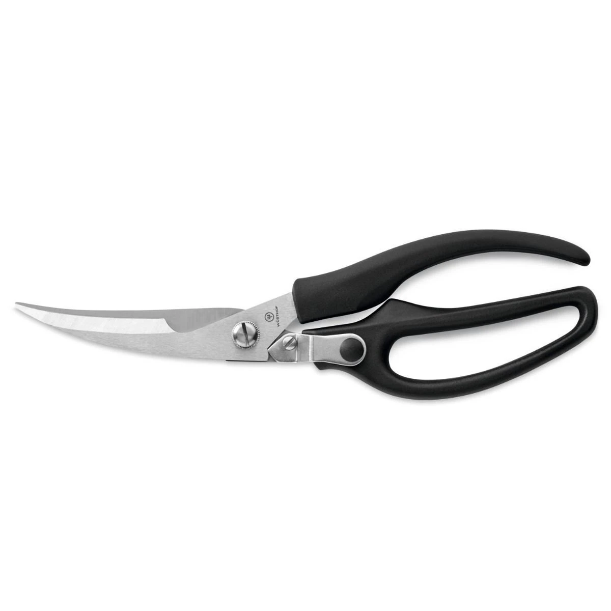 The Wusthof Poultry Shears in Black are the ideal tool for chicken, turkey, duck, or goose. The sharp, slightly curved stainless-steel blades are ideal for skinning, jointing, and spatchcocking poultry; the Poultry Shears can easily get through thinner bones. An internal spring between the blades and the sturdy handles ensures fatigue-free working.